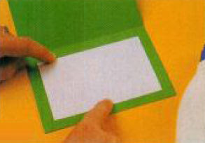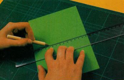 1) Para hacer la base de cartón, cortamos un rectángulo de papel verde en el tamaño de 14.5 cm x 21 cm, después con la ayuda de la regla y del boleador, doblamos en el medio de la tarjeta.